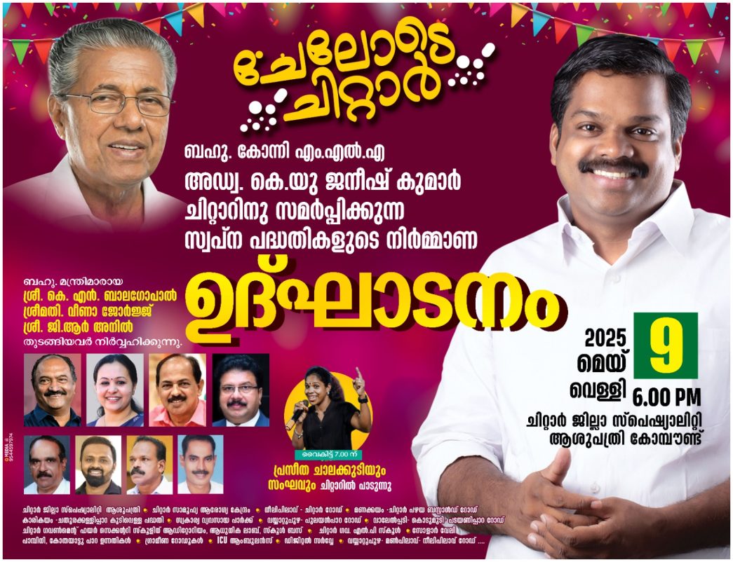 ഇതോടൊപ്പം ചിറ്റാർ പഞ്ചായത്തിൽ മാത്രം നിർമ്മാണം പൂർത്തിയായതും പ്രവർത്തികൾ നടന്നുവരുന്നതും ആരംഭിക്കുന്നതുമായ കോടിക്കണക്കിന് രൂപയുടെ പദ്ധതികളും ഉദ്ഘാടനം ചെയ്യും.